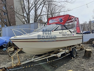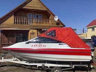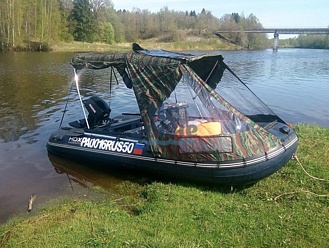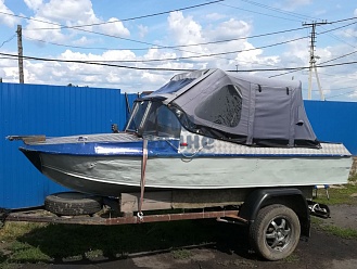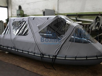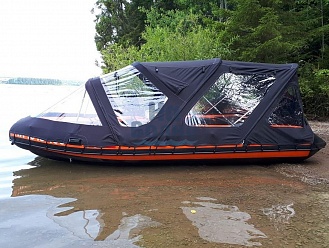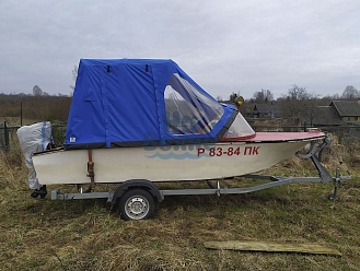 Тент с задней дверью для выхода к мотору, небольшими боковыми окнами и усиленными краями для установки застёжек. Изготовлен из специализированной тентовой ткани Оксфорд 600 повышенной плотности